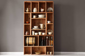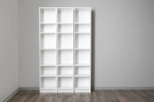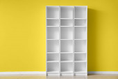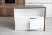 Białe szafki wiszące na jasnej ścianie w kuchni