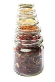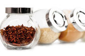Różnego rodzaju przypraw w szklanych butelkach na białym tle