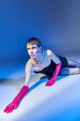 osoba niebinarna w lamparcie nadruk top i różowe spodnie na pomarańczowym tle, queer fashion, banner