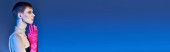 portret, queer modelka z makijażem dotykająca szyi na szarości, piękna, androgynous, zamknięte oczy, baner