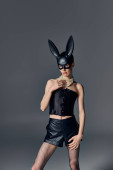 moda, płeć w gorsecie pozowanie w bdsm maska króliczka na szary, queer styl, ręce na biodrach