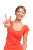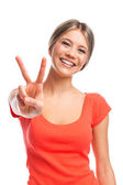 Zdjęcie "kobieta wyświetlone znak zwycięstwo." może być wykorzystywane do celów osobistych i komercyjnych zgodnie z warunkami zakupionej licencji Royalty-free. Obraz jest dostępny do pobrania w jakości wysokiej rozdzielczości do 5760x3840.