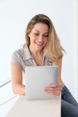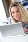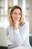 uśmiechający się urzędniczka z przodu komputera przenośnego
