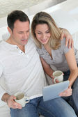 para siedzi w kanapie z elektroniczną kartę