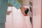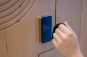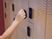 Kobieta otwiera elektroniczny zamek szafki w szatni z bransoletką.