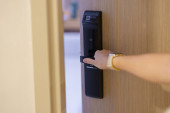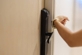 Zdjęcie "Kobieta otwiera elektroniczny zamek szafki w szatni z bransoletką." może być wykorzystywane do celów osobistych i komercyjnych zgodnie z warunkami zakupionej licencji Royalty-free. Obraz jest dostępny do pobrania w jakości wysokiej rozdzielczości do 5760x3840.