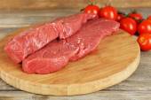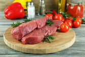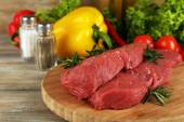 Surowy befsztyk na deski do krojenia warzyw i przypraw na drewniane tła