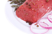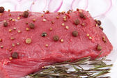Surowy befsztyk z rozmarynem i czosnkiem na papierze na drewniane tła