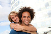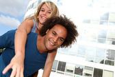 Młoda para siedzi w kampusie stoczni