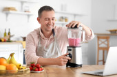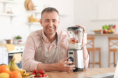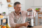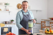Zdjęcie "Dojrzały mężczyzna wlewa świeże smoothie z blendera do szkła w kuchni" może być wykorzystywane do celów osobistych i komercyjnych zgodnie z warunkami zakupionej licencji Royalty-free. Obraz jest dostępny do pobrania w jakości wysokiej rozdzielczości do 5760x3840.