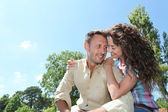 miłości para siedzi na ponton nad jeziorem