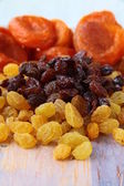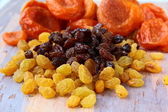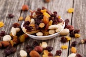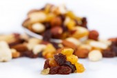 Mieszane orzechy i sułtanki na płytce na białym tle