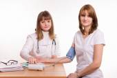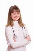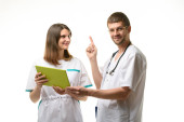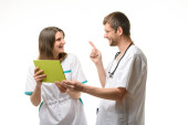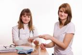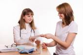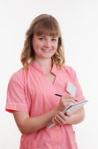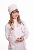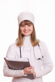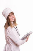 Oficer medyczny w biały płaszcz pisze w notatnik informacji