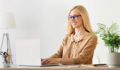 Zdjęcie "Biznes i przedsiębiorczość Kariera. Wesoła bizneswoman Korzystanie z laptopa, wpisując pracy online i uśmiech do kamery siedzi przy biurku w nowoczesnym wnętrzu biura. Zatrudnienie i skuteczna praca" może być wykorzystywane do celów osobistych i komercyjnych zgodnie z warunkami zakupionej licencji Royalty-free. Obraz jest dostępny do pobrania w jakości wysokiej rozdzielczości do 5760x3840.