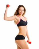 Zdjęcie "Jest piękna kobieta lekkoatletycznego z hantlami robi treningu sportowego," może być wykorzystywane do celów osobistych i komercyjnych zgodnie z warunkami zakupionej licencji Royalty-free. Obraz jest dostępny do pobrania w jakości wysokiej rozdzielczości do 5760x3840.