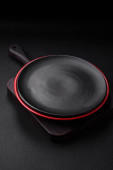 Zdjęcie "Pusta czarna płyta na ciemnym kamiennym tle z przestrzenią do kopiowania. Widok z góry" może być wykorzystywane do celów osobistych i komercyjnych zgodnie z warunkami zakupionej licencji Royalty-free. Obraz jest dostępny do pobrania w jakości wysokiej rozdzielczości do 5760x3840.