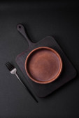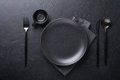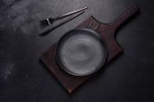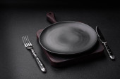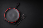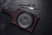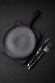 Zdjęcie "Pusta czarna płyta na ciemnym kamiennym tle z przestrzenią do kopiowania. Widok z góry" może być wykorzystywane do celów osobistych i komercyjnych zgodnie z warunkami zakupionej licencji Royalty-free. Obraz jest dostępny do pobrania w jakości wysokiej rozdzielczości do 5760x3840.