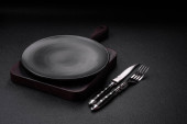 Pusta czarna płyta na ciemnym kamiennym tle z przestrzenią do kopiowania. Widok z góry