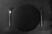 Pusta czarna płyta na ciemnym kamiennym tle z przestrzenią do kopiowania. Widok z góry