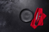 Zdjęcie "Pusta czarna płyta na ciemnym kamiennym tle z przestrzenią do kopiowania. Widok z góry" może być wykorzystywane do celów osobistych i komercyjnych zgodnie z warunkami zakupionej licencji Royalty-free. Obraz jest dostępny do pobrania w jakości wysokiej rozdzielczości do 5760x3840.