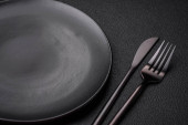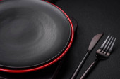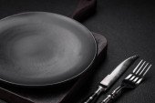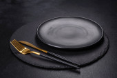 Zdjęcie "Pusta czarna płyta na ciemnym kamiennym tle z przestrzenią do kopiowania. Widok z góry" może być wykorzystywane do celów osobistych i komercyjnych zgodnie z warunkami zakupionej licencji Royalty-free. Obraz jest dostępny do pobrania w jakości wysokiej rozdzielczości do 5760x3840.