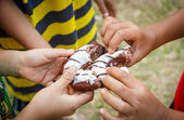 Dzielenie się jedzeniem. Kobiet dając krakingu do małego dziecka. C cele charytatywne