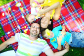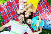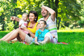 Szczęśliwa młoda para z dziećmi zabawy w parku