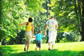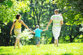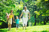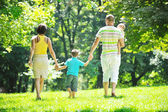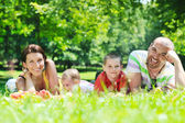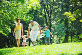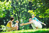 Szczęśliwa młoda para z dziećmi zabawy w parku