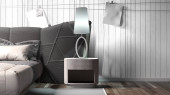 Zdjęcie "Biały nowoczesny design oczyszczacz powietrza, osuszacz w beżowej brązowej sypialni ściennej, szare pokrywy łóżka, tropikalna palma w świetle słonecznym na parkiecie drewnianym dla ochrony zdrowia, tło technologii medycznej 3" może być wykorzystywane do celów osobistych i komercyjnych zgodnie z warunkami zakupionej licencji Royalty-free. Obraz jest dostępny do pobrania w jakości wysokiej rozdzielczości do 5760x3840.