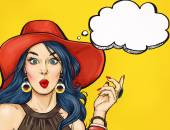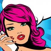 Pop-Art ilustracja kobieta z mowy Bańka mrówka retro telefon. Dziewczyna pop-artu. Zaproszenie na przyjęcie. Kartkę z życzeniami urodzinowymi. Zadzwoń do mnie. Słodkie dziewczyny zaskoczony przez wywołanie. Starodawny sztuka plakatu.