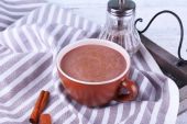 Filiżanka kakao łyżką na serwetka na drewniane tła