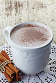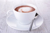 Filiżanka kakao łyżką na serwetka na drewniane tła