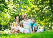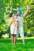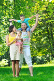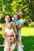 Szczęśliwa młoda para z dziećmi zabawy w parku