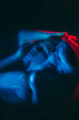 Przygnębiona twarz. Kolorowy portret światła. Podwójna ekspozycja nieszczęśliwej nieuśmiechniętej kobiety z bólem duszy odizolowanej na neonowym niebieskim tle pustej przestrzeni.