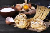 Przygotowując maszyna makaron przez makaron na rustykalne drewniane tła