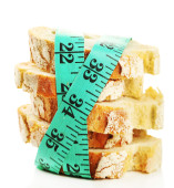 Świeży chleb z taśma miernicza, na białym tle biały - pojęcie diety