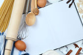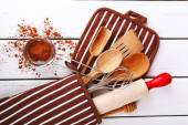 Zestaw naczynia kuchenne w rękawica na drewniane tła