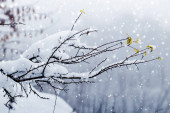 Ośnieżona gałąź głogu z czerwonymi jagodami na brzegu rzeki w zimie