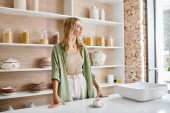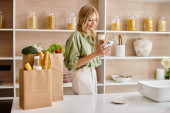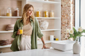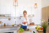 Zdjęcie "radosna kobieta w średnim wieku myjąca pomidory wiśniowe i patrząca na świeżą zieleń w nowoczesnej kuchni" może być wykorzystywane do celów osobistych i komercyjnych zgodnie z warunkami zakupionej licencji Royalty-free. Obraz jest dostępny do pobrania w jakości wysokiej rozdzielczości do 5760x3840.