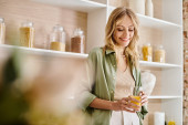 Zdjęcie "szczęśliwy w średnim wieku kobieta z blond włosy trzymając butelkę i kieliszek z czerwonym winem w nowoczesnej kuchni" może być wykorzystywane do celów osobistych i komercyjnych zgodnie z warunkami zakupionej licencji Royalty-free. Obraz jest dostępny do pobrania w jakości wysokiej rozdzielczości do 5760x3840.