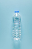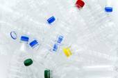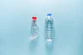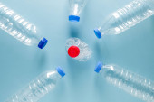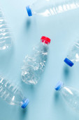 Rozgniecione plastikowe butelki z wodą z niebieskimi wieczkami stojące wokół zgniecionej plastikowej butelki z czerwonym wieczkiem na niebieskim tle