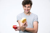 Młody człowiek z jabłkiem i szklanką soku na zielonym tle