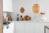 Zdjęcie "Wnętrze nowoczesnej kuchni ze stylowym dywanem, koszem na śmieci i białymi licznikami" może być wykorzystywane do celów osobistych i komercyjnych zgodnie z warunkami zakupionej licencji Royalty-free. Obraz jest dostępny do pobrania w jakości wysokiej rozdzielczości do 5760x3840.