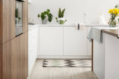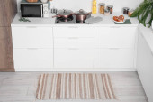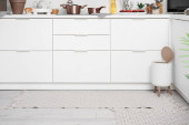 Wnętrze nowoczesnej kuchni ze stylowym dywanem, koszem na śmieci i białymi licznikami