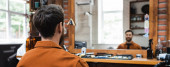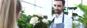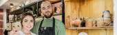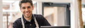 wesoły kierownik imprezy patrząc na kamerę w pobliżu rozmazanego zespołu pracującego w sali bankietowej, baner