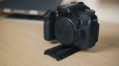 Czarny profesjonalny aparat w kobiecych rękach. Kształcenie zawodowe dziennikarzy