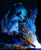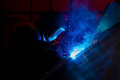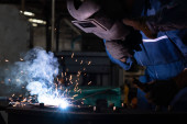 Umiejętny pracownik metalowy pracujący z maszyną do spawania łukowego w fabryce, noszący sprzęt bezpieczeństwa. Usługi związane z produkcją i konserwacją wyrobów metalowych według koncepcji pracy fizycznej
