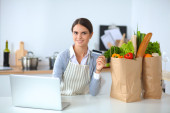 Uśmiechnięta kobieta zakupy online przy użyciu komputera i karty kredytowej w kuchni