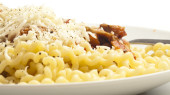 makaron rotini z sosem pomidorowym, serem i kiełbasa z papryką i cebulą