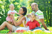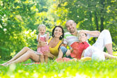 Szczęśliwa młoda para z dziećmi zabawy w parku
